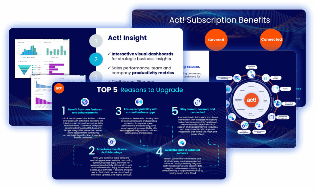 Using an older version of Act!? There’s never been a better time to upgrade! Check out what’s new since your version, explore the benefits of integrated CRM and email marketing, learn about the risks of outdated software, and find out why thousands of Act! users like you have made the leap to an Act! subscription!